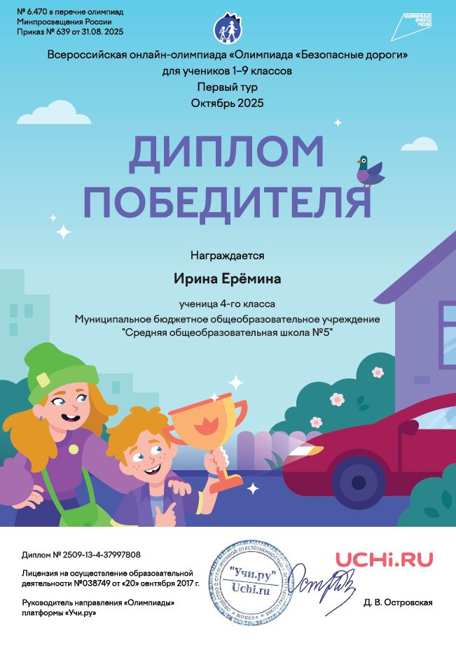 1. Диплом победителя всероссийской онлайн-олимпиады Учи.ру «Безопасные дороги», октябрь 2025 г. (Ерёмина Ирина)