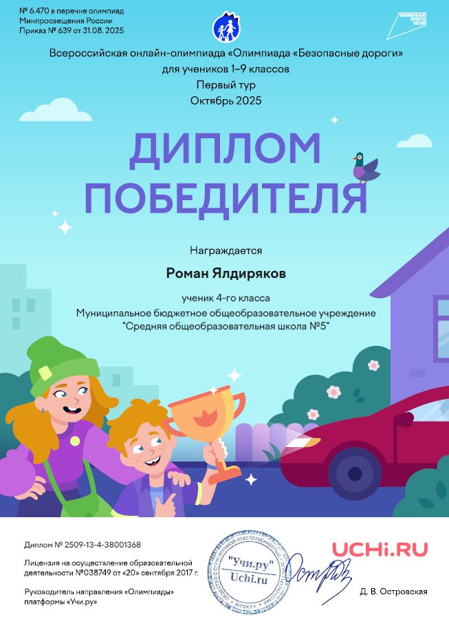 7. Диплом победителя всероссийской онлайн-олимпиады Учи.ру «Безопасные дороги», октябрь 2025 г. (Ялдиряков Роман)