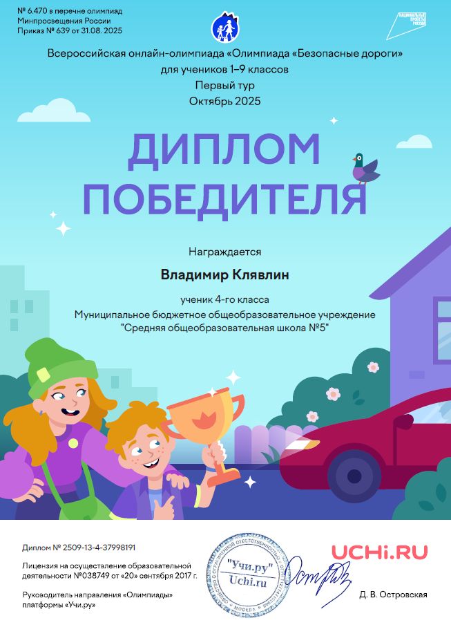 2. Диплом победителя всероссийской онлайн-олимпиады Учи.ру «Безопасные дороги», октябрь 2025 г. (Клявлин Владимир)