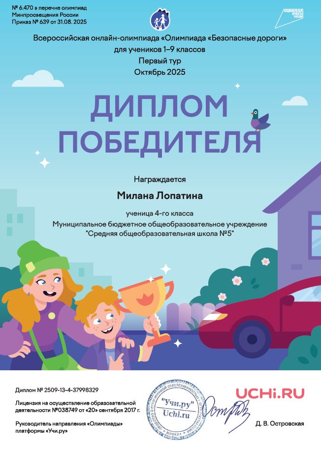 3. Диплом победителя всероссийской онлайн-олимпиады Учи.ру «Безопасные дороги», октябрь 2025 г. (Лопатина Милана)