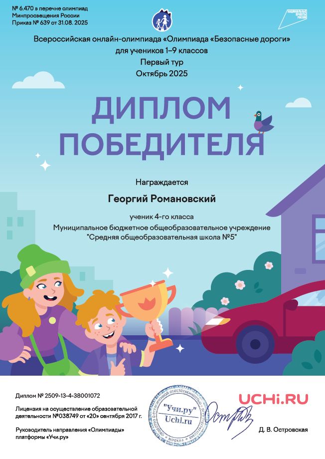 4. Диплом победителя всероссийской онлайн-олимпиады Учи.ру «Безопасные дороги», октябрь 2025 г. (Романовский Георгий)