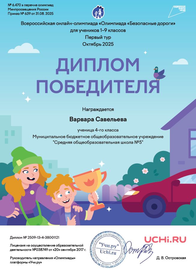 5. Диплом победителя всероссийской онлайн-олимпиады Учи.ру «Безопасные дороги», октябрь 2025 г. (Савельева Варвара)
